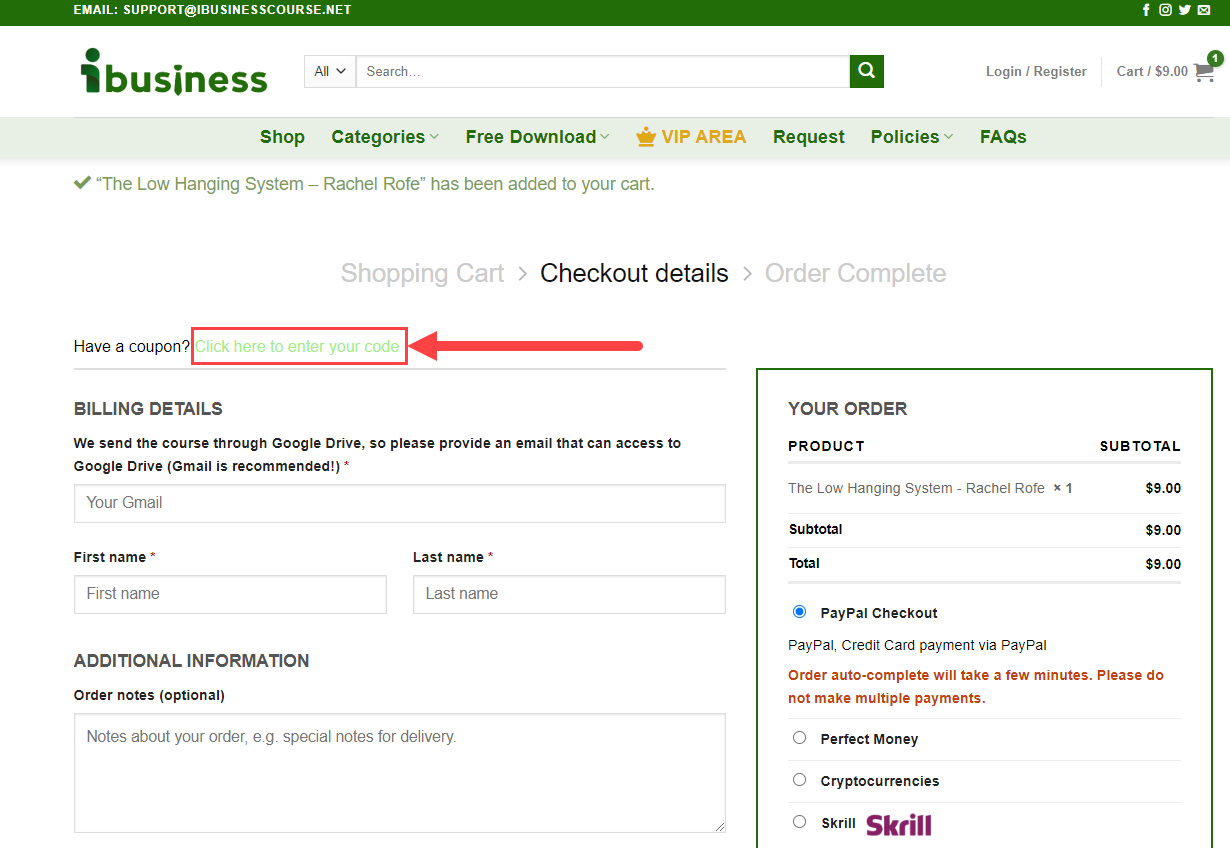 Scenario 1a: Visit the link https://www.ibusinesscourse.net/cart/, then copy the coupon code and add it to the specified field as shown in the image.